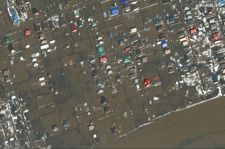 A handout satellite image from Maxar Technologies of flooding near Orenburg airbase on April 3 – Copyright AFP DAVID GRAY, Jim WATSON, Eugene Hoshiko