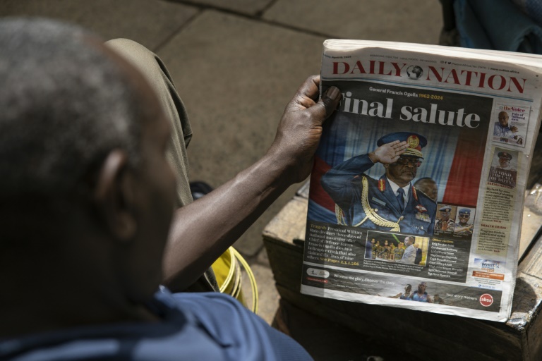 The crash made front page news across Kenya and President William Ruto attended Saturday’s military tribute – Copyright AFP SIMON MAINA